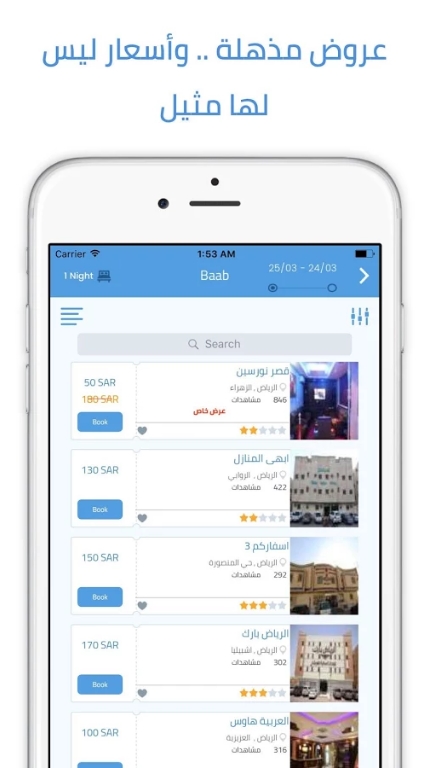 يقدم التطبيق باقة متنوعة من الشقق الفندقية المفروشة في المملكة السعودية وبأسعار تنافسية.